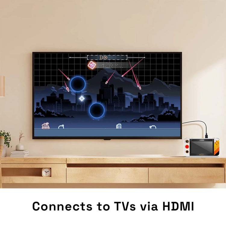 The integrated paddle, d-pad, trak-ball, numeric keypad, bumpers, and classic gamepad buttons (A,B,X,Y) allow you to play every game in the collection with the controls it was designed for. "SmartGlow" technology highlights what controls work best with each game. The 7-inch high-resolution display, game save options, and WiFi connectivity upgrade the experience for modern gamers. Play on the big screen with HDMI output and USB-C ports to attach external controllers. Also includes a pop-out stand and rechargeable battery with 4-5 hours of play time.