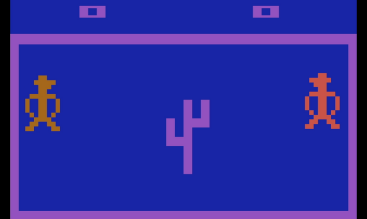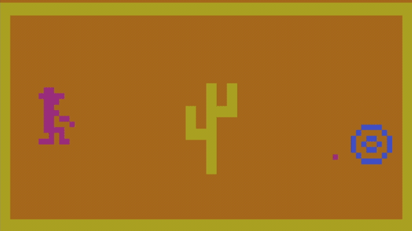 Based on the 1976 Atari arcade game of the same name, Outlaw is an exciting game for one or two players set in the wild west. While the original arcade game only allowed for a single gunslinger, the Atari 2600 version released in 1978 gives you the option to play alone, where you can practice your aim against moving targets, or against another gunslinger in a contest to see who can first score ten hits against the other player.